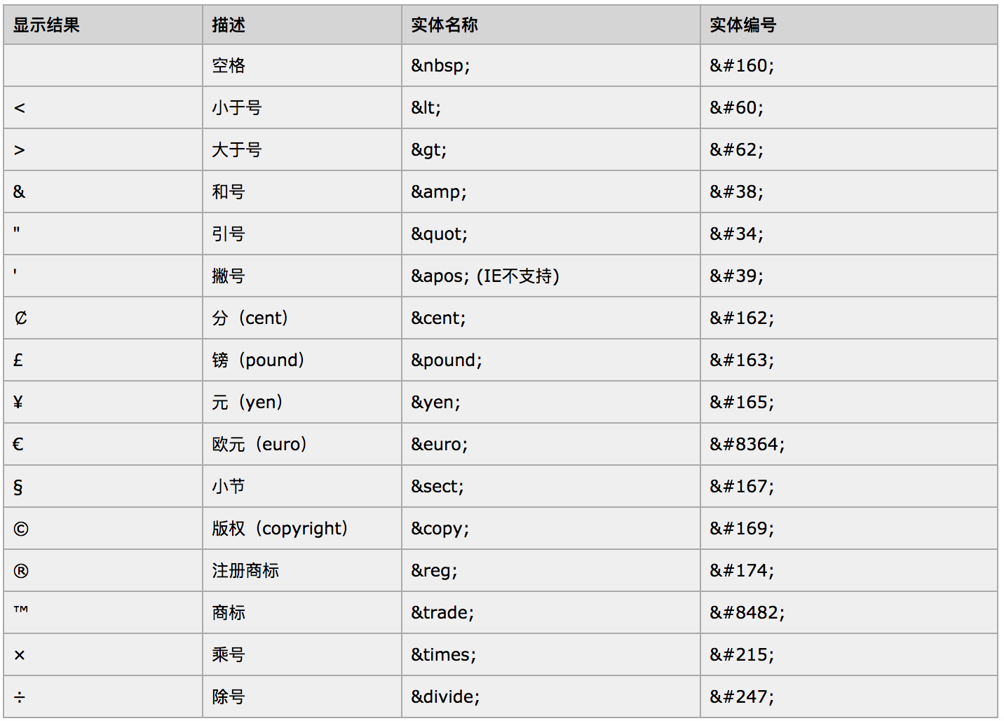 常见的HTML实体编码如下: