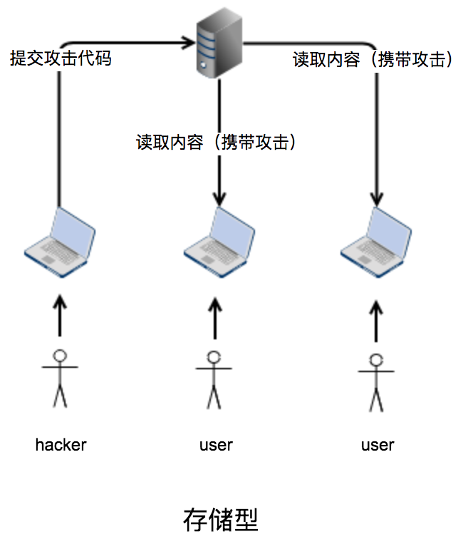 存储型存储型攻击方式和反射型最大的区别就是不通过URL来传播,而是利用站点本身合法的存储结构,比如评论。任何用户都可以通过站点提供的接口提交评论内容,这些评论内容都被存储到服务器的数据库。当用户访问这些评论的时候,服务器从数据库提取内容插入到页面反馈给用户。如果评论内容本身是具备攻击性内容,用户无一幸免。攻击流程图如下: