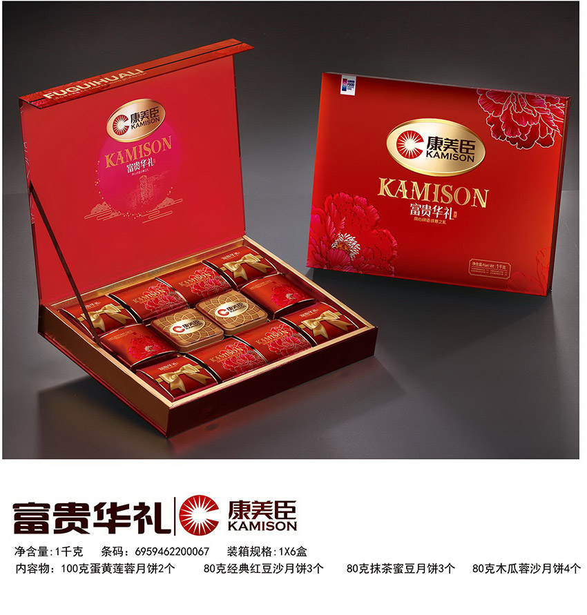 品牌:康美臣 产品分类:月饼 内容物:100克蛋黄莲蓉月饼2个 80克经典红豆沙月饼3个 80克抹茶蜜豆月饼3个 80克木瓜蓉沙月饼4个 净含量:1千克 装箱规格:1×6盒